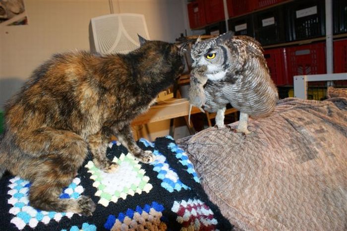 eagle owl and cat friends