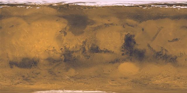 Because the orbit of Mars is eccentric its apparent magnitude at opposition from the Sun can range from −3.0 to −1.4. The minimum brightness is magnitude +1.6 when the planet is in conjunction with the Sun. Mars usually appears a distinct yellow, orange, or reddish color, however the actual color of Mars is closer to butterscotch, and the redness seen is actually just dust in the planet's atmosphere; considering this NASA's Spirit rover has taken pictures of a greenish-brown, mud-colored landscape with blue-grey rocks and patches of light red colored sand. When farthest away from the Earth, it is more than seven times as far from the latter as when it is closest. When least favorably positioned, it can be lost in the Sun's glare for months at a time. At its most favorable times—at 15- or 17-year intervals, and always between late July and late September—Mars shows a wealth of surface detail to a telescope. Especially noticeable, even at low magnification, are the polar ice caps.