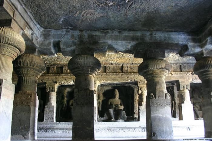 The Indra Sabha (Cave 32) is a two storeyed cave with one more monolithic shrine in its court. It has a very fine carving of the lotus flower on the ceiling. It got the appellation, Indra Sabha probably it is significantly ornate and also because of the sculpture of Yaksha Matanga on an elephant, which was wrongly identified as that of Indra. On the upper level of the double-storied shrine excavated at the rear of the court, an imposing image of Ambika, the Yakshi (dedicated attendant deity) of Neminatha is found seated on her lion under a mango tree, laden with fruits.