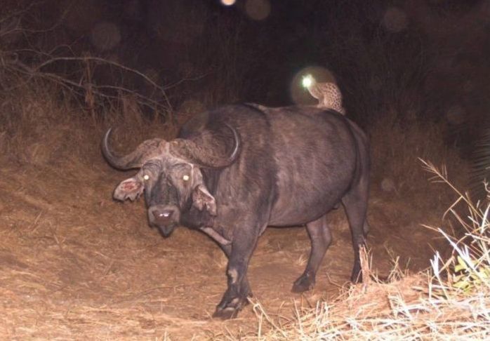 Genet Riding Buffalos And Rhinoceros, Hluhluwe–iMfolozi Park, Durban, Zululand, KwaZulu-Natal, South Africa